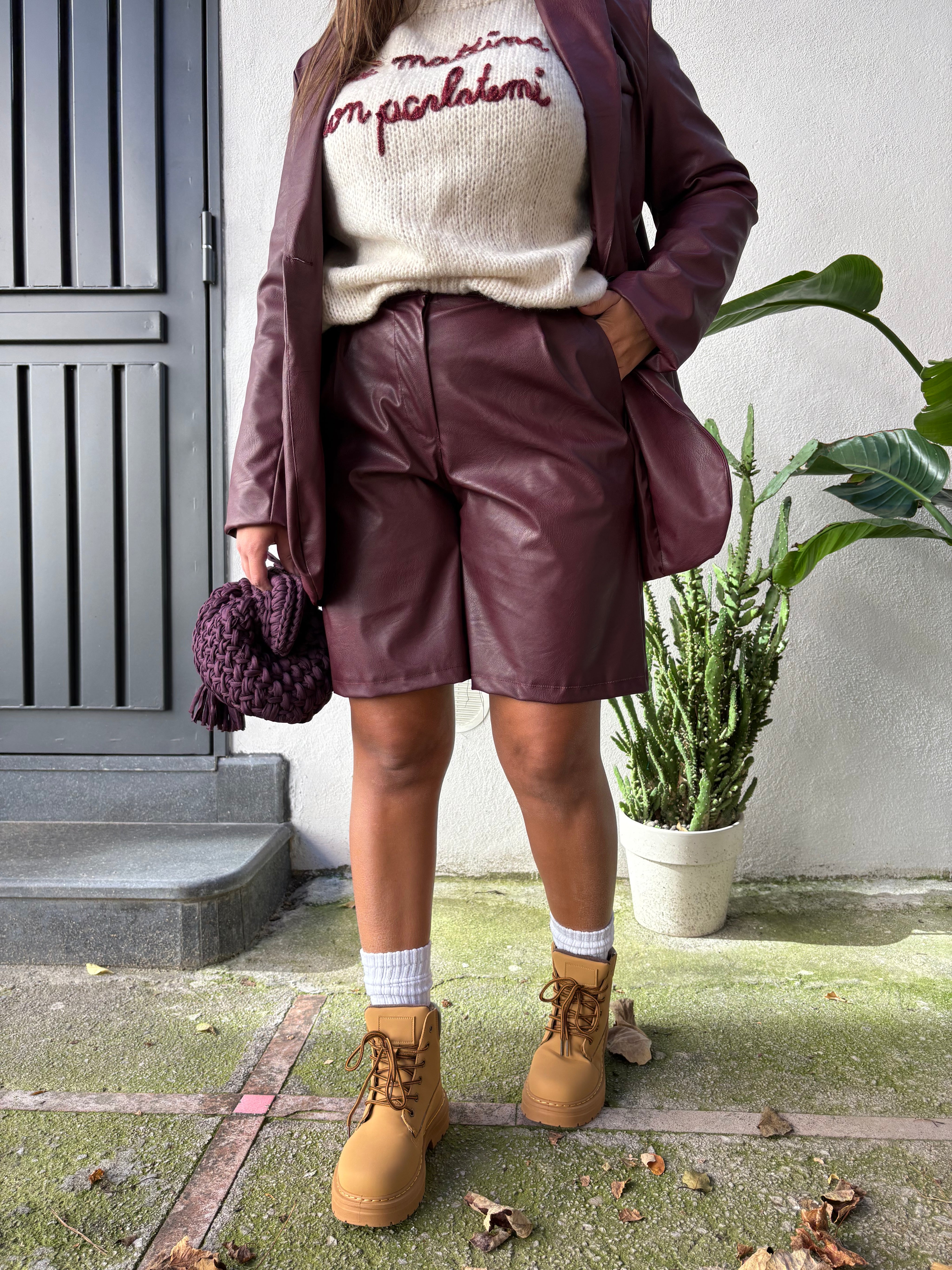 Coordinato in ecopelle composto da giacca e bermuda. La giacca modello over taglia unica, bermuda S M L. Veste regolare.