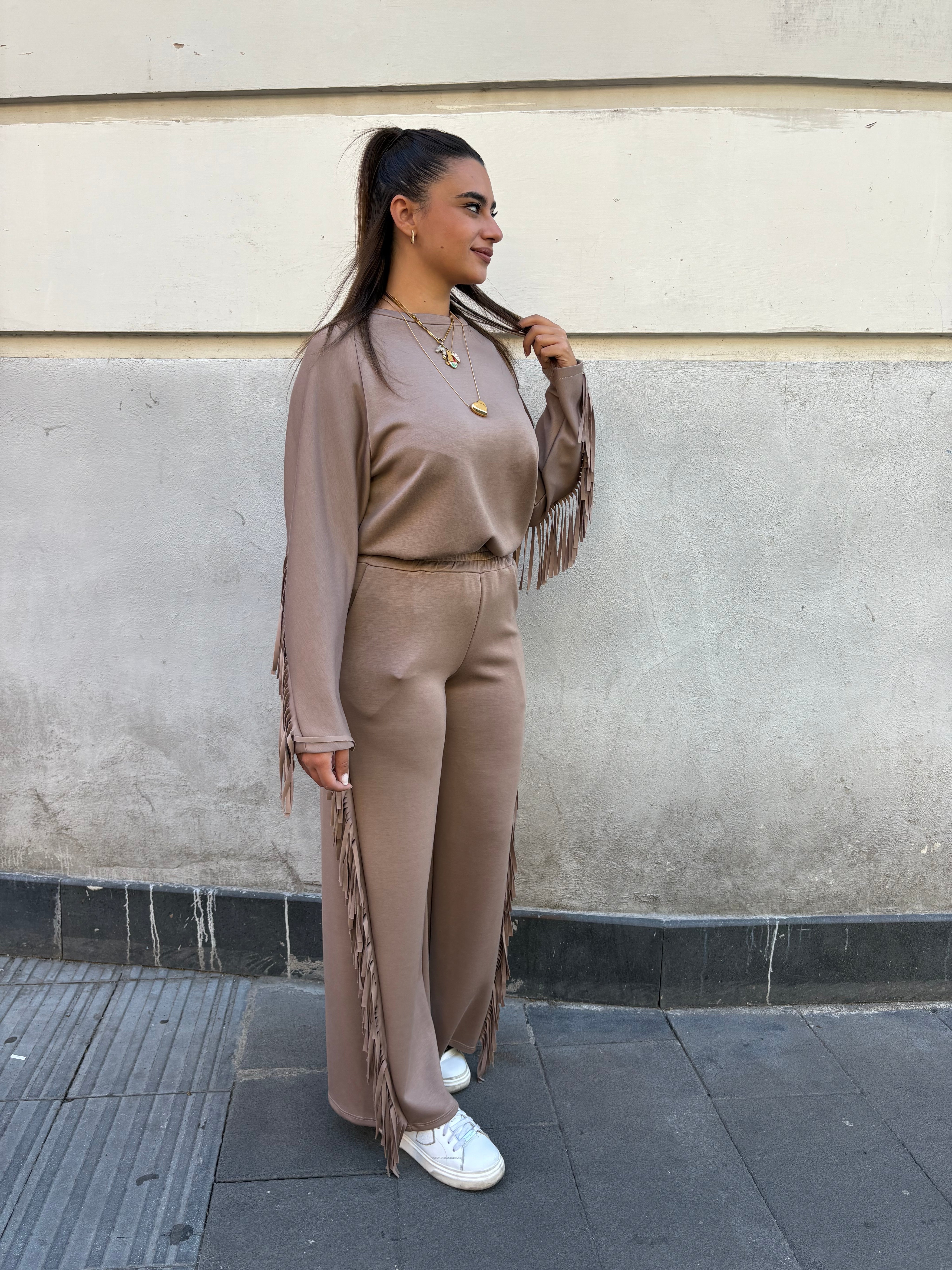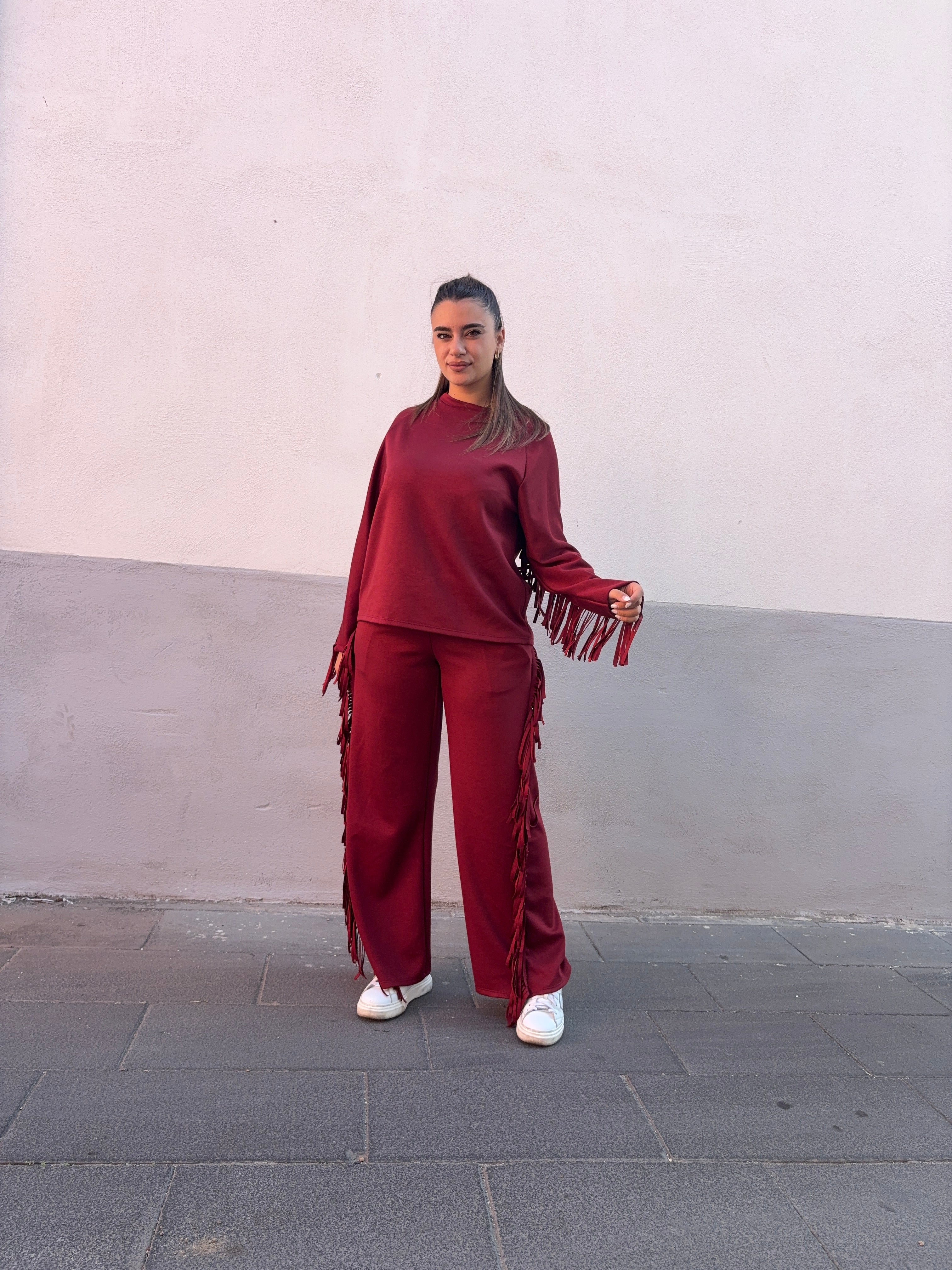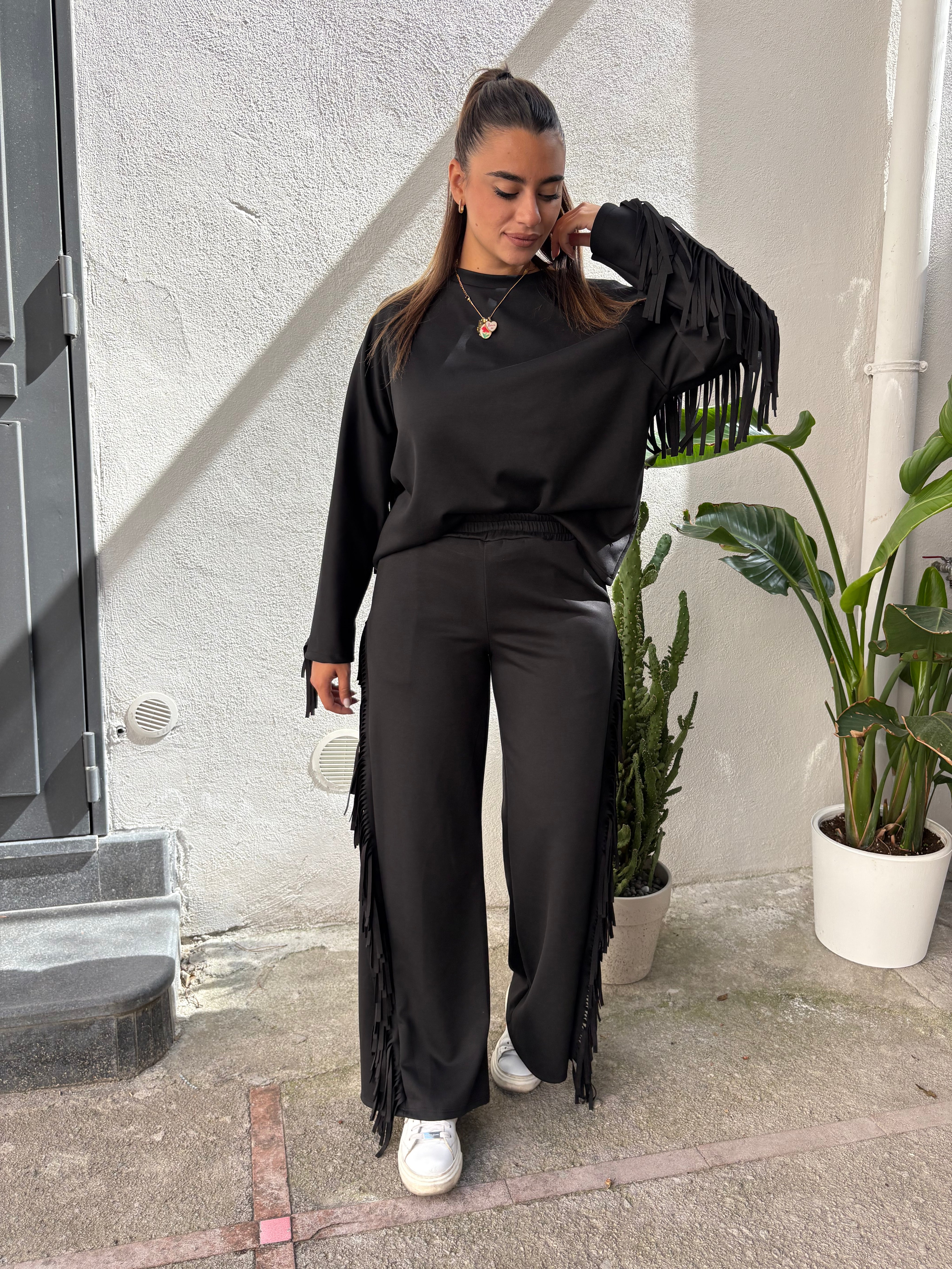 Coordinato composto da felpa e pantalone a zampa con frange, anche sul retro. Disponibile in più colori. Veste da una 38 ad una 48.