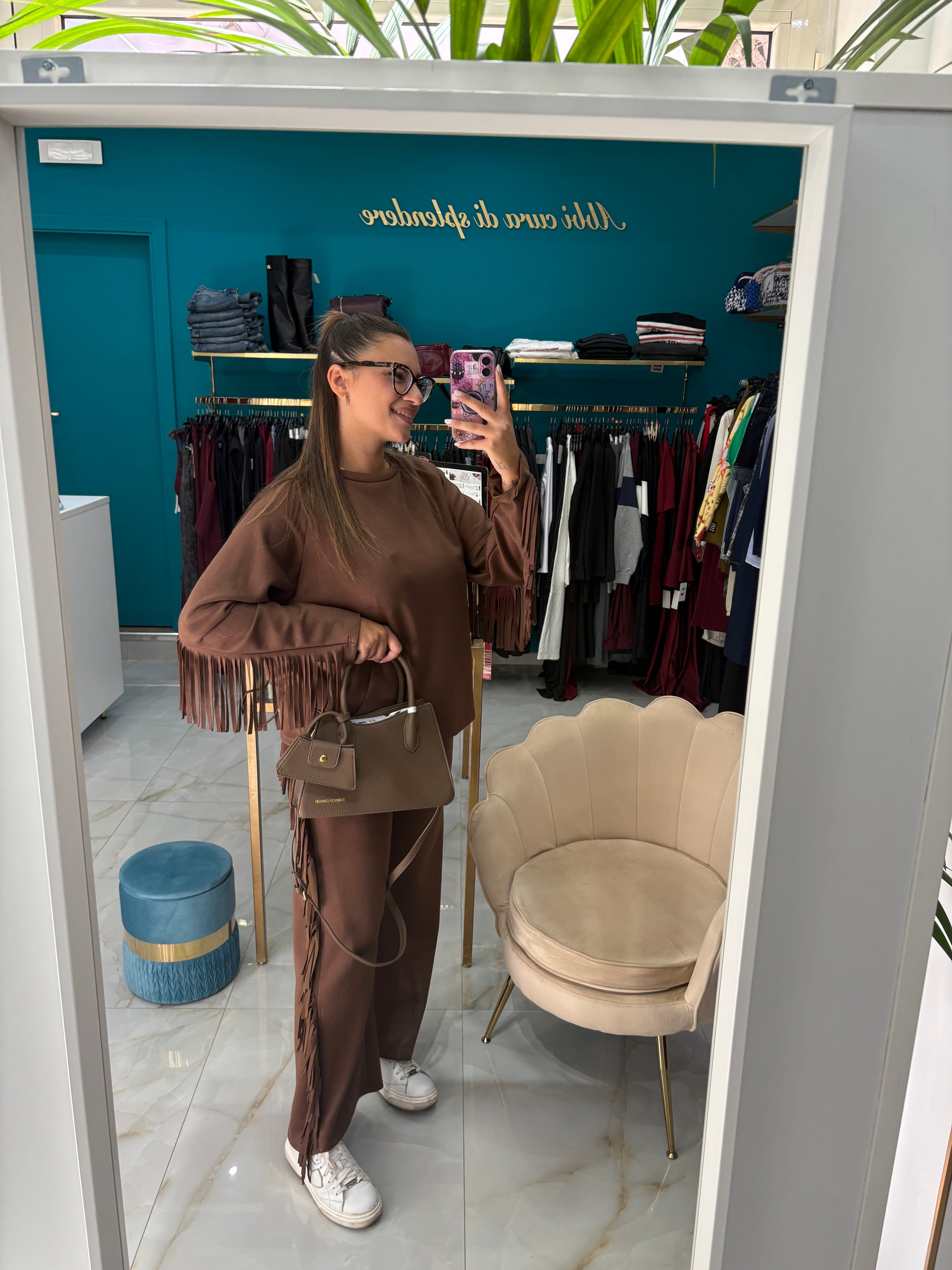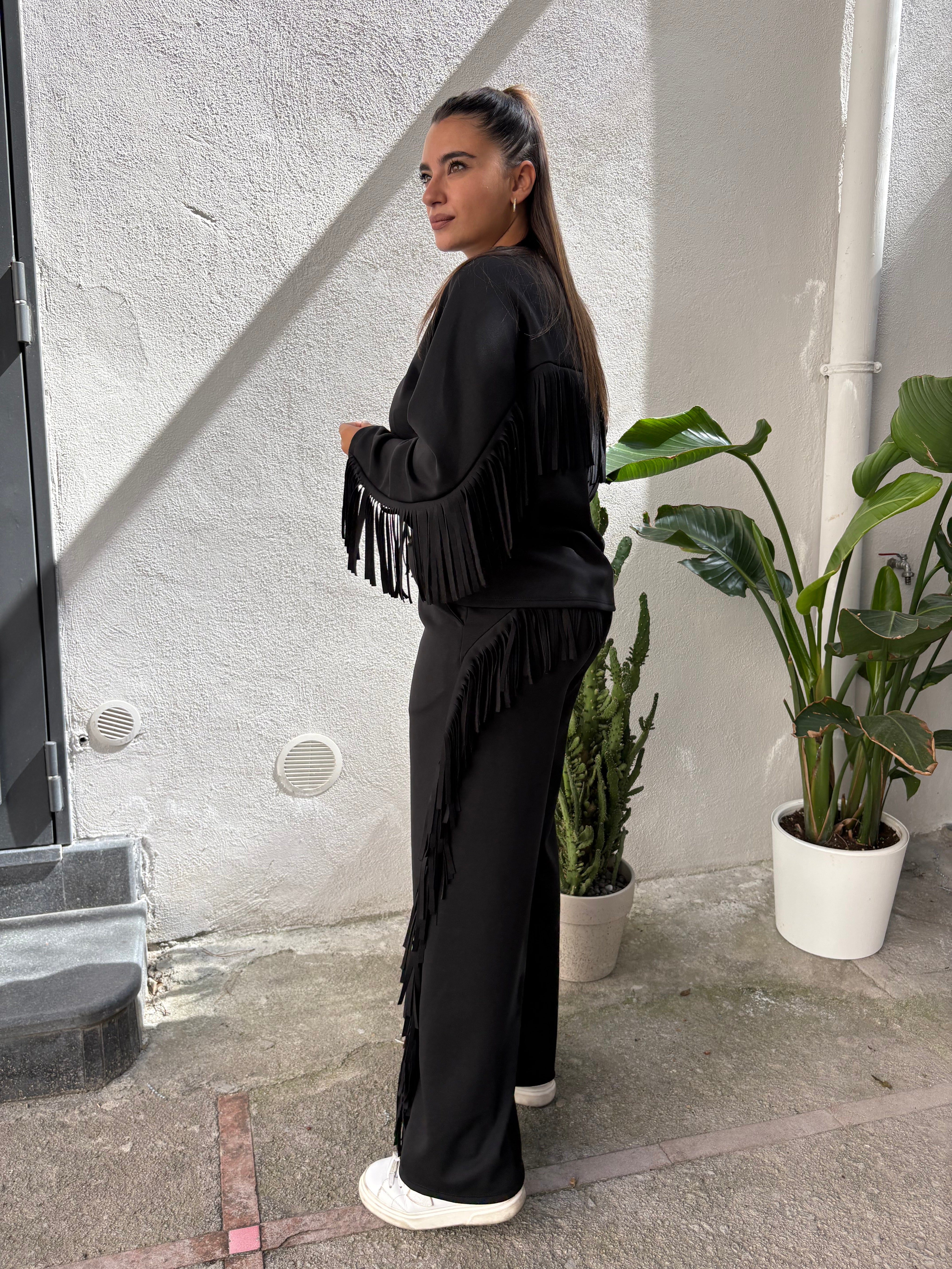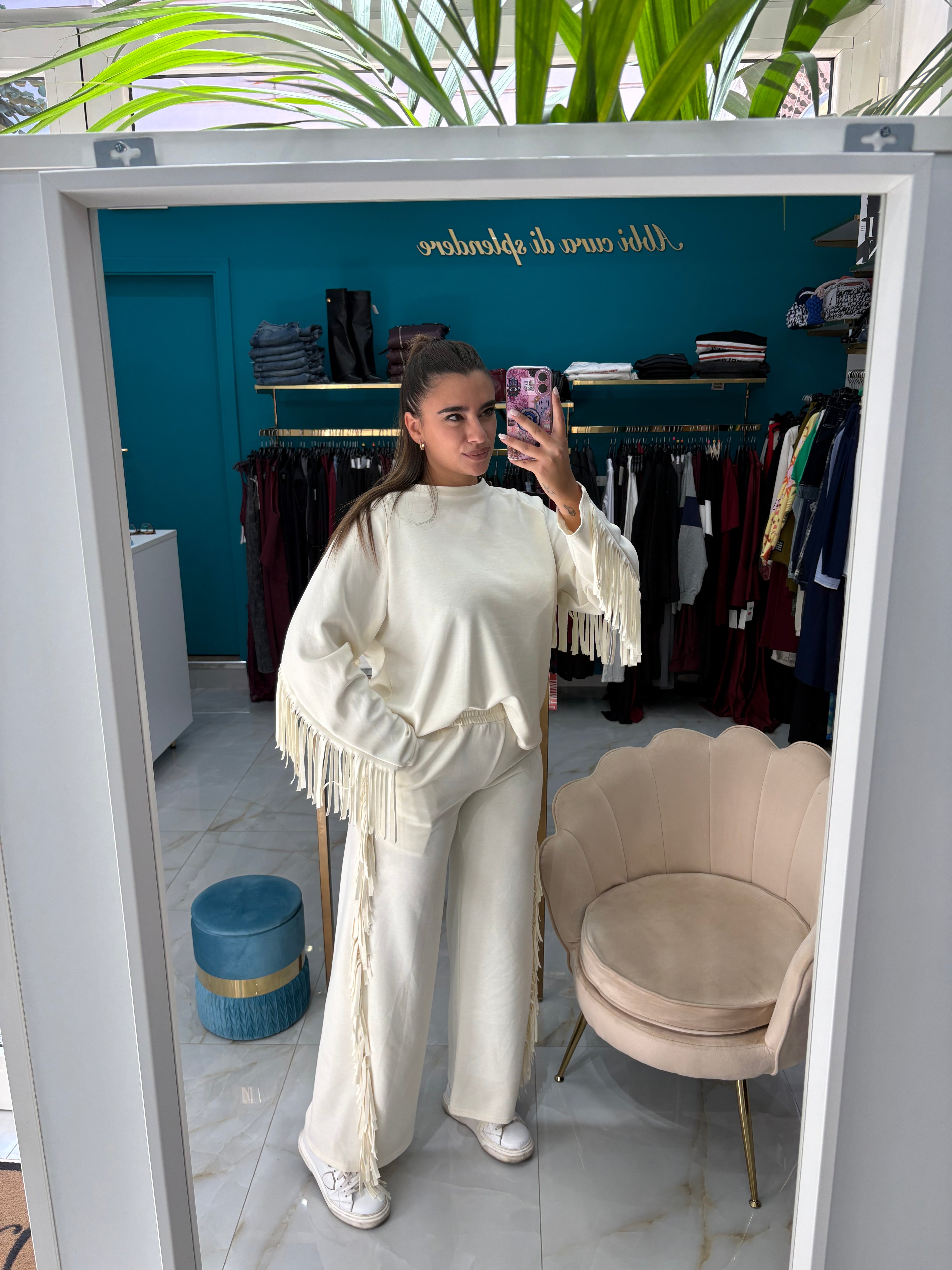 Coordinato composto da felpa e pantalone a zampa con frange, anche sul retro. Disponibile in più colori. Veste da una 38 ad una 48.