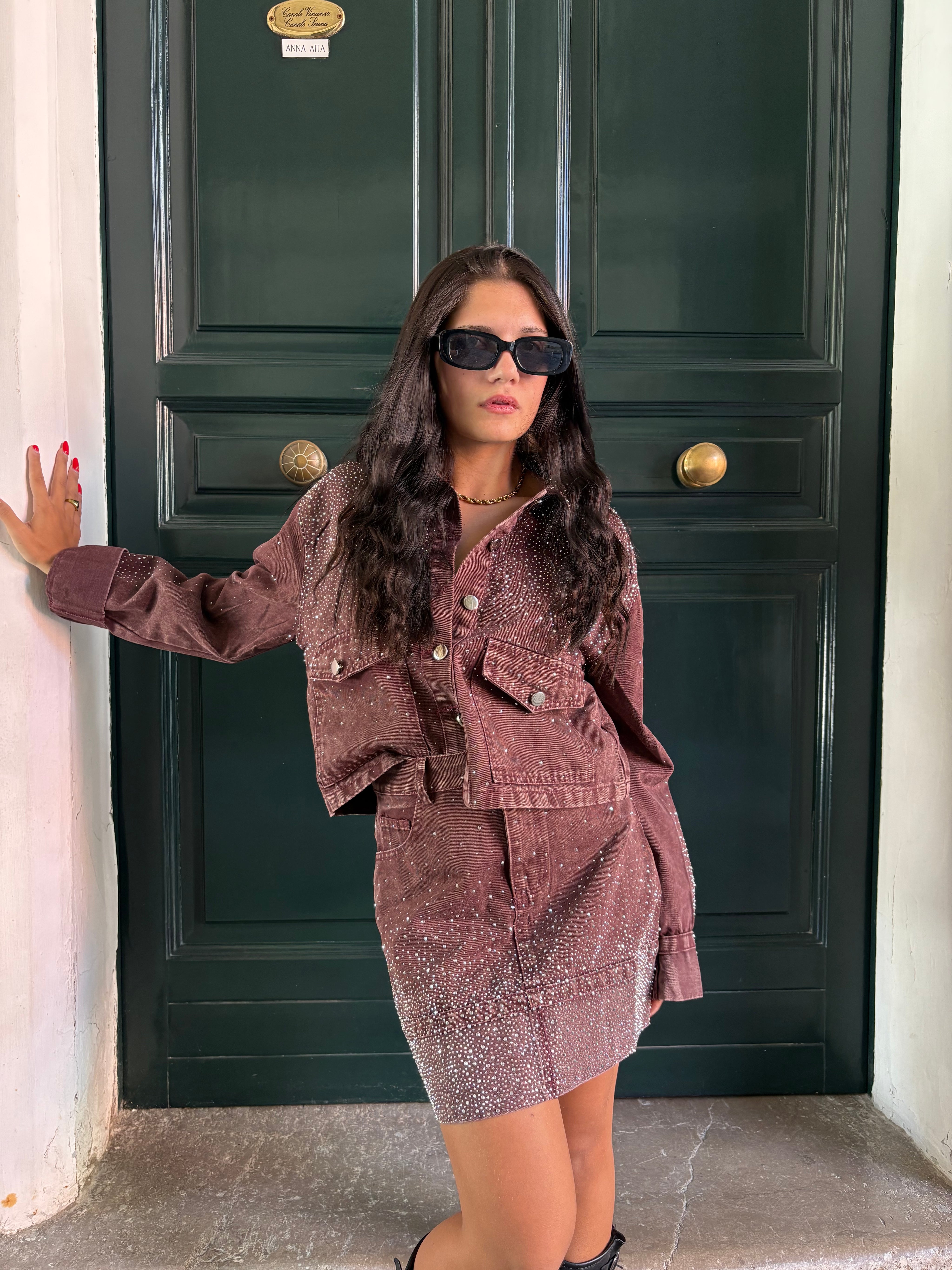 Coordinato composto da giacca crop e gonna. Con micro brillantini. Veste regolare, tessuto non elastico.
