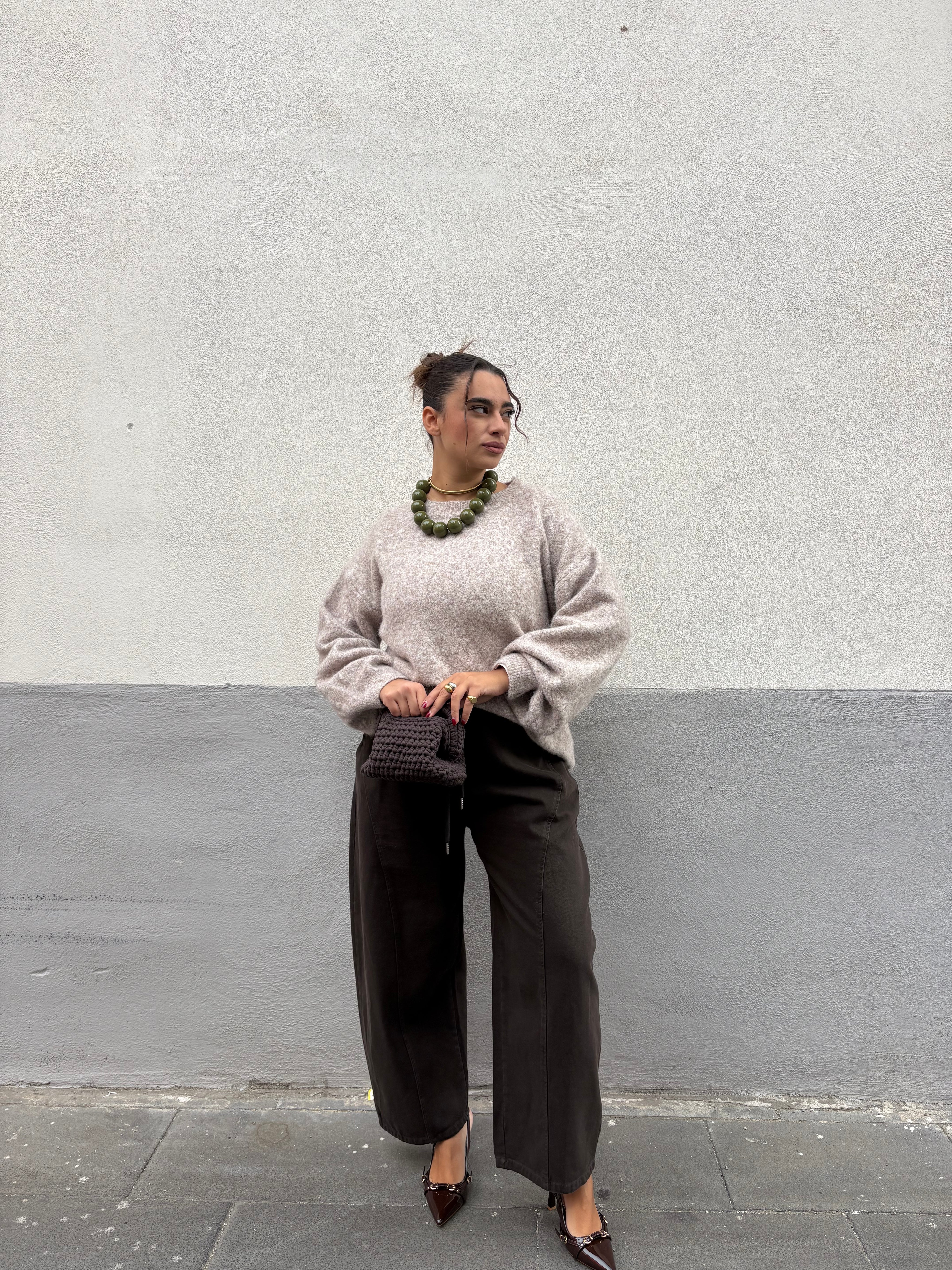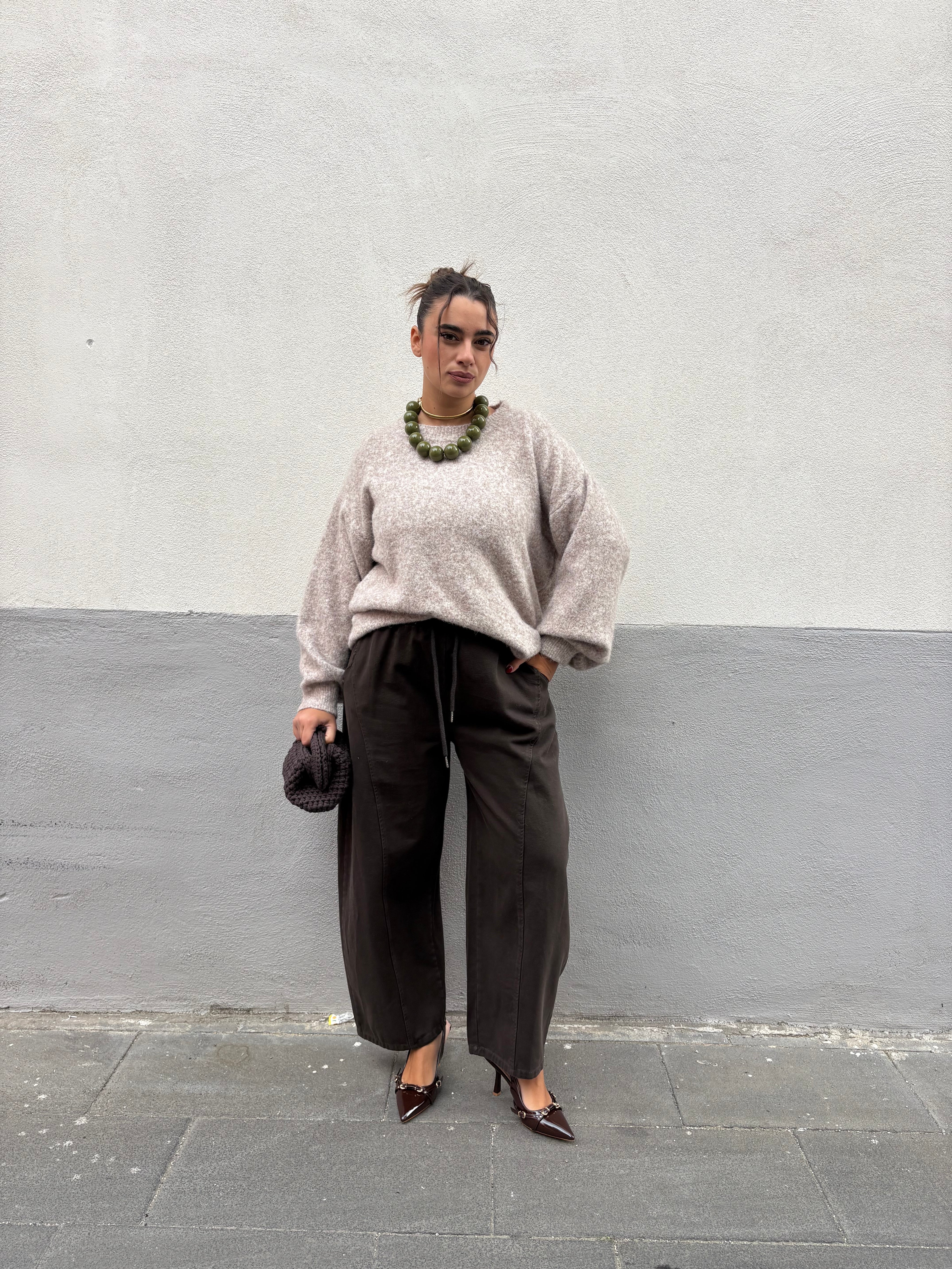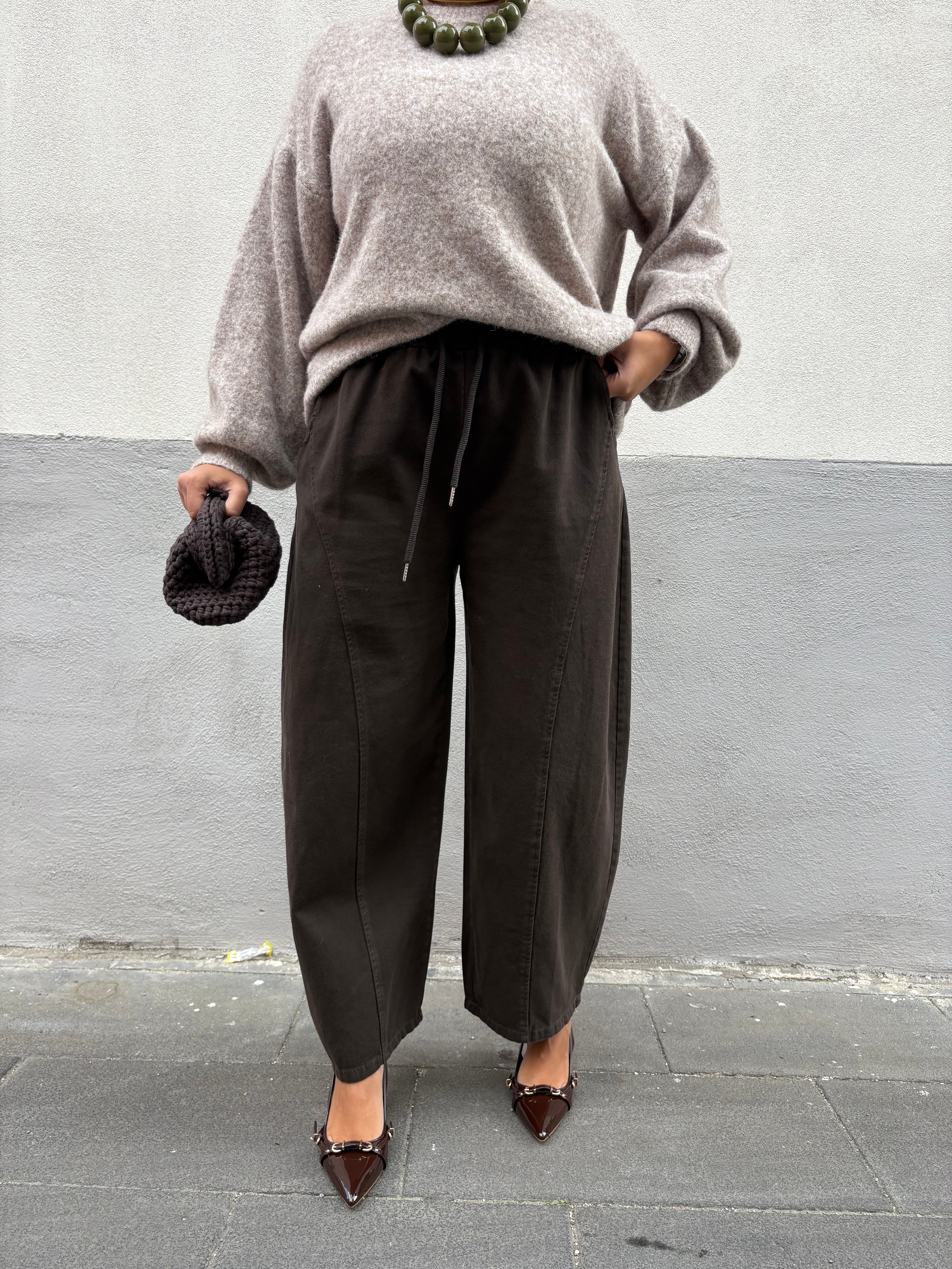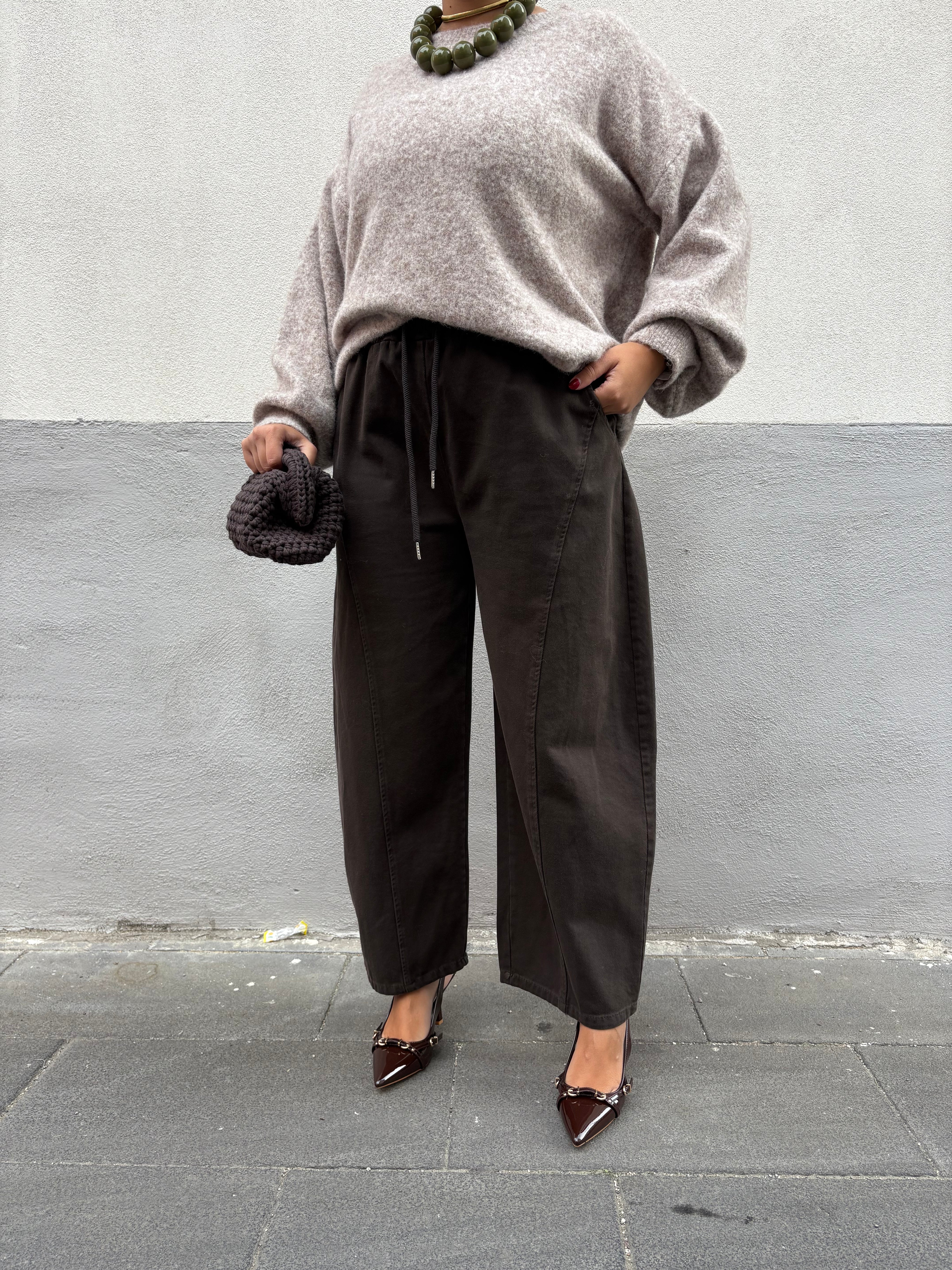 Jeans Ballon marrone, con elastico in vita: veste da una 38 ad una 46.