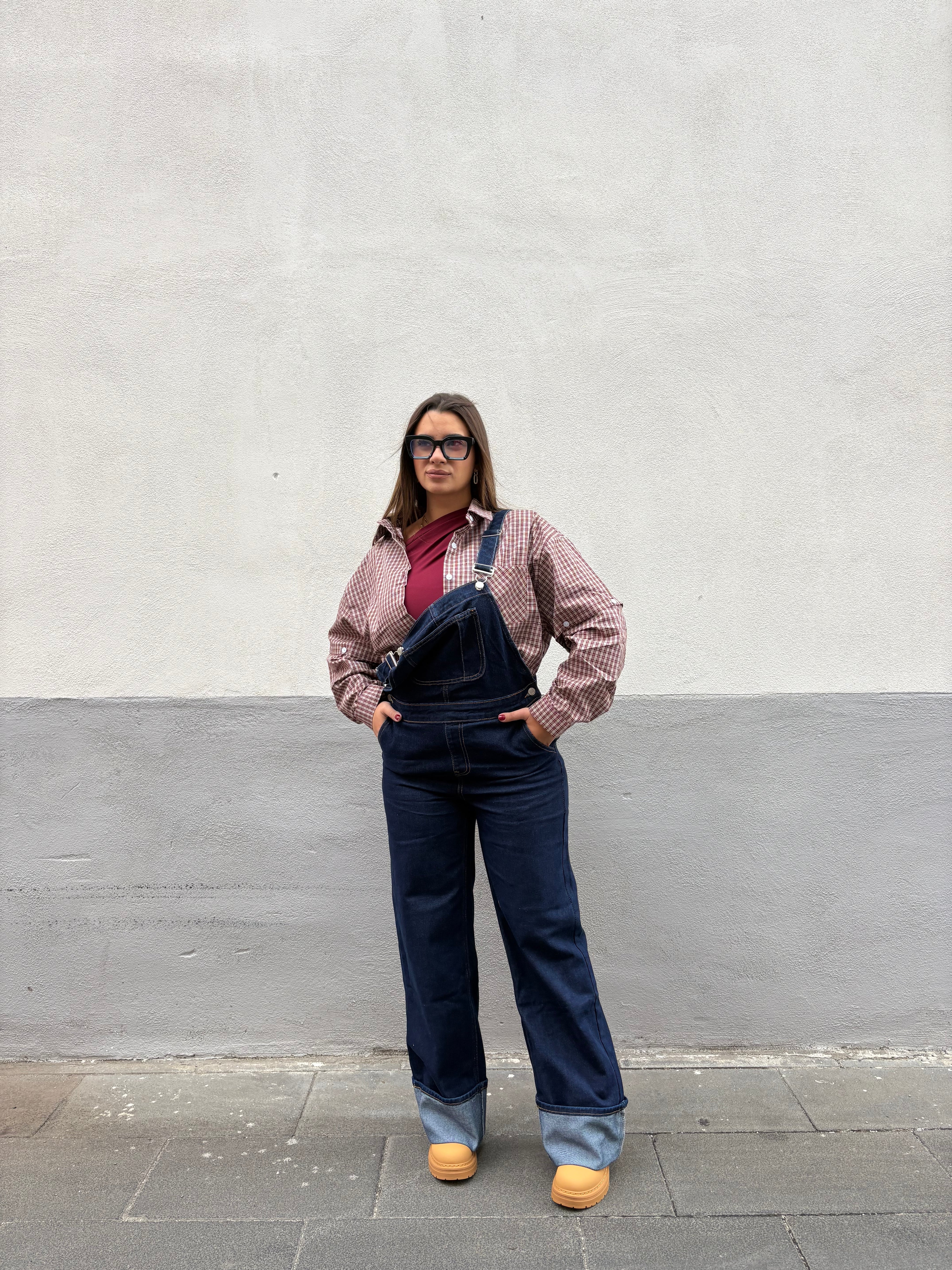 salopette in jeans con piegone sotto, veste regolare, modello leggermente elastico.