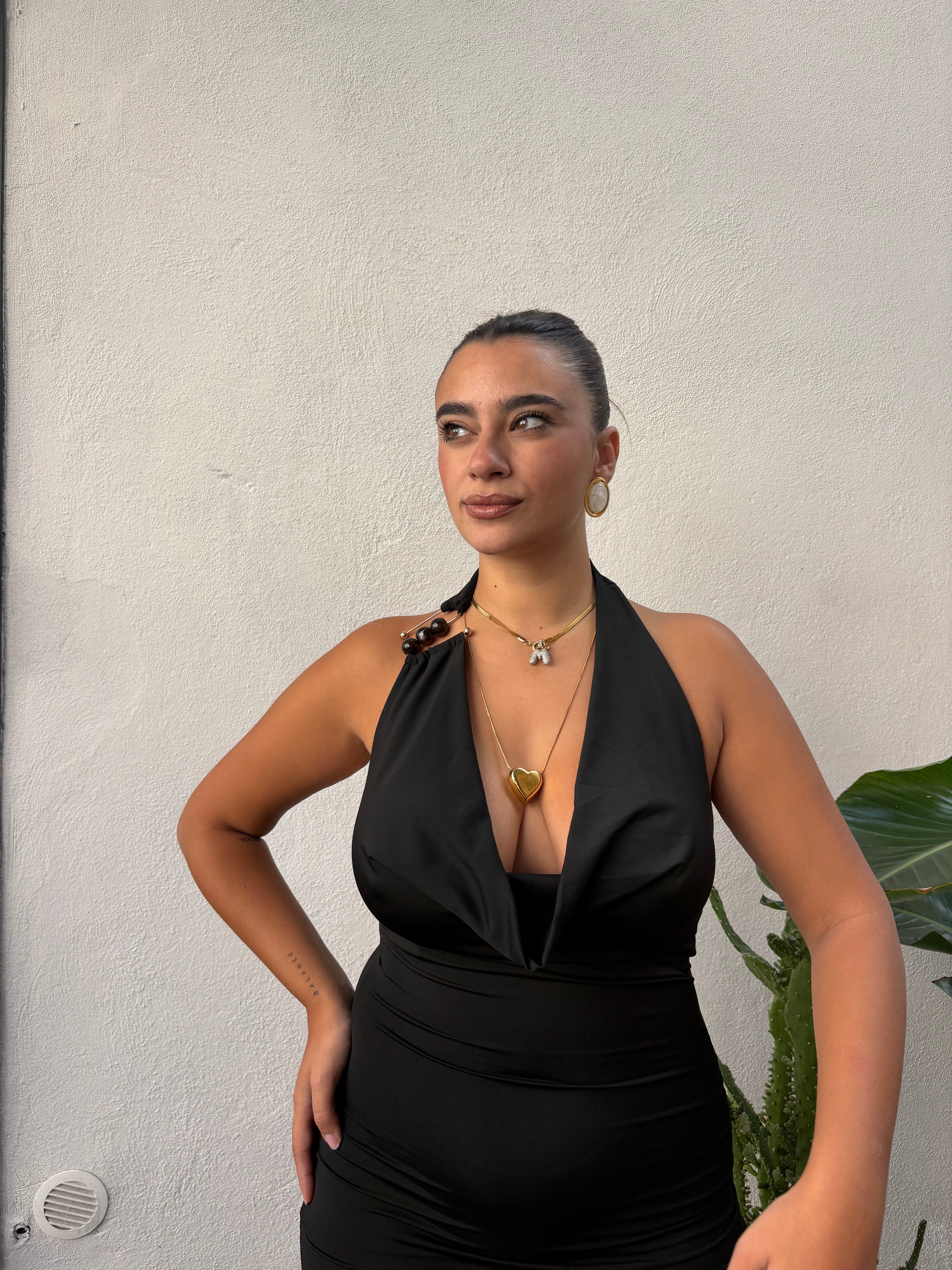 Abito in lycra scollo morbido, con particolarità sul collo della spilla con perle. Taglia unica veste da una xs ad una XL.