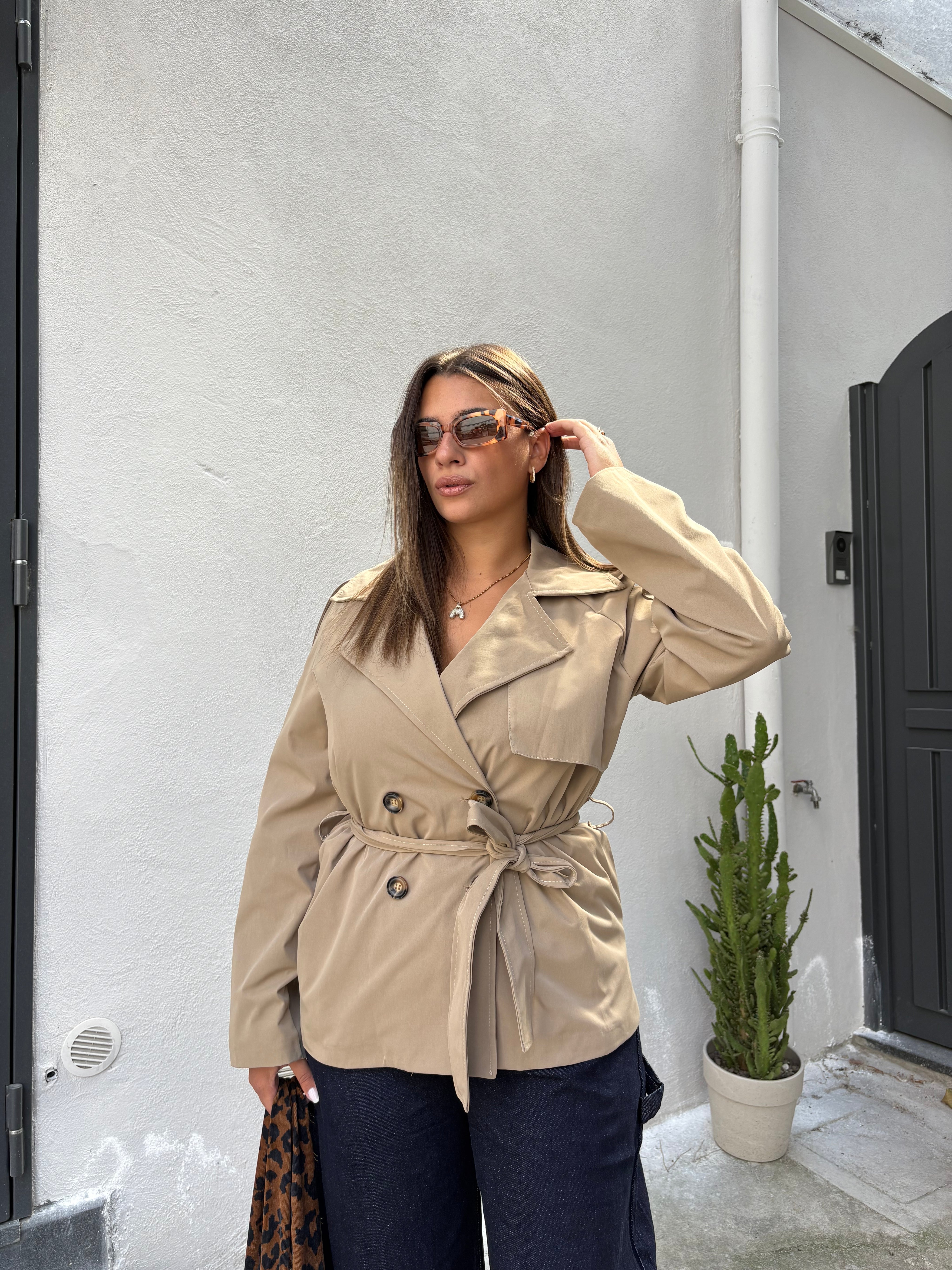 Trench cammello, lunghezza normale, con bottoni e cintura. Veste da una 38 ad una 46.