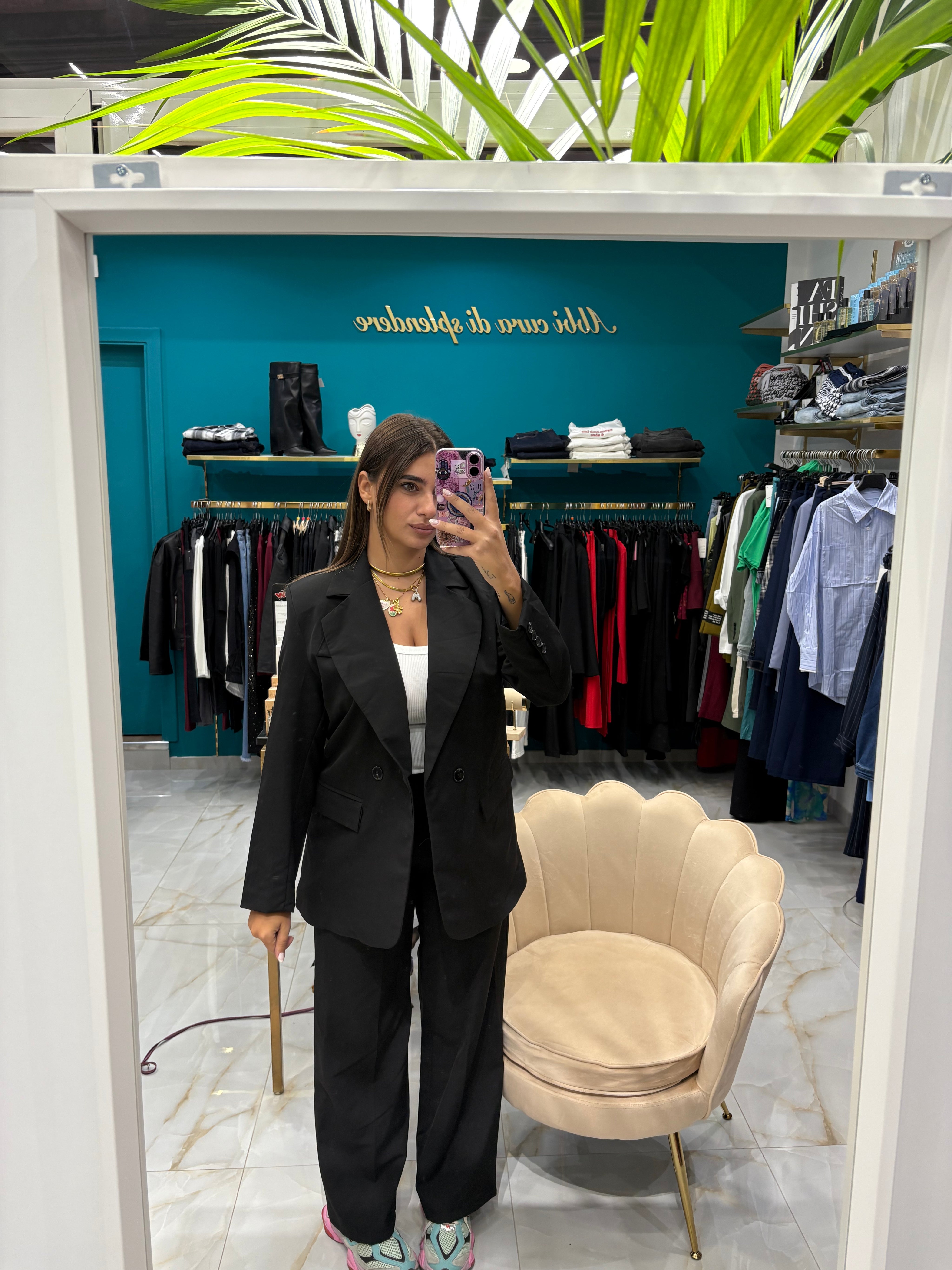 Tailleur con giacca doppio petto, pantalone palazzo con elastico in vita. Veste da una 38 ad una 46.