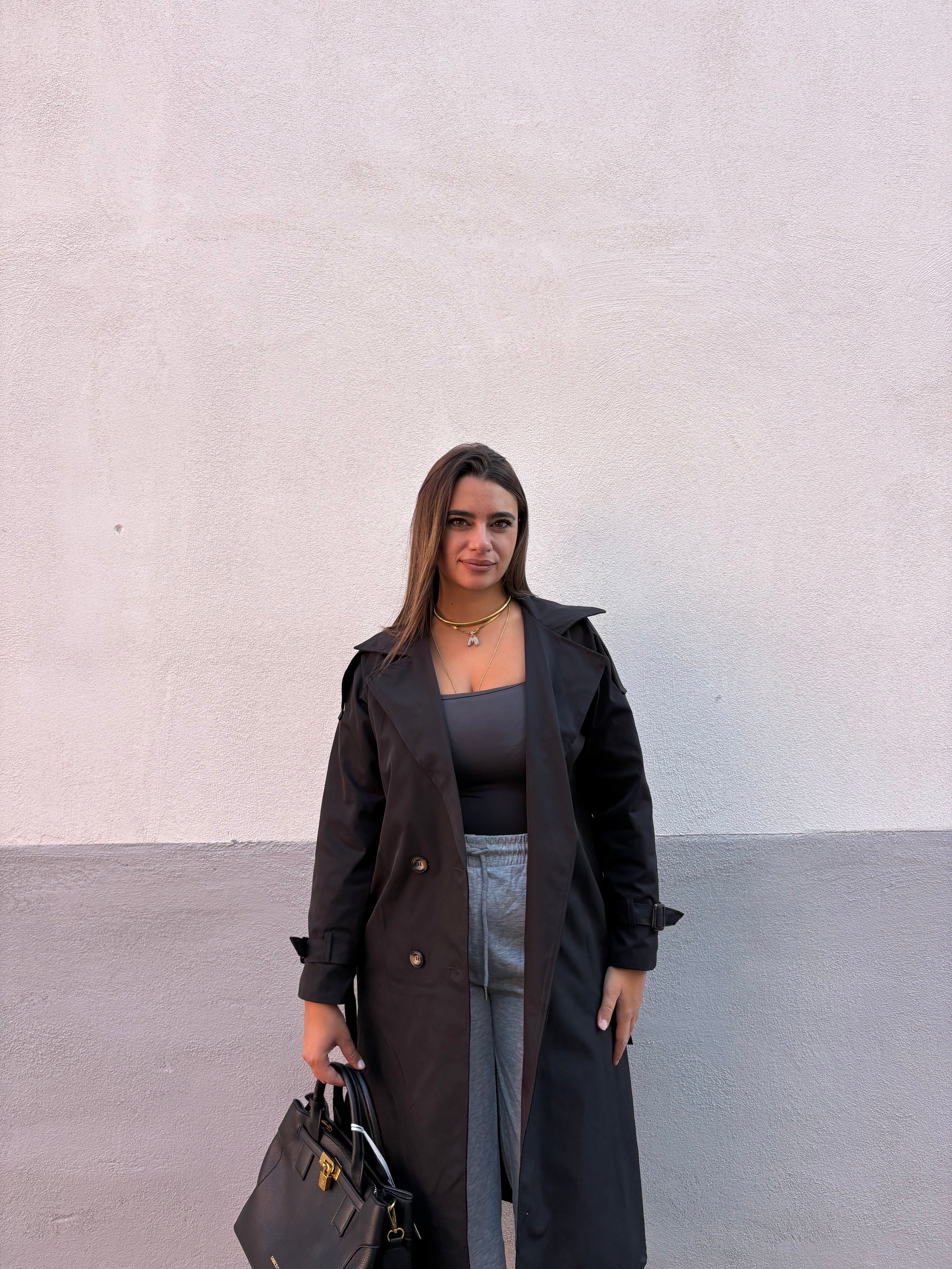 Trench non foderato all’interno, doppio petto con cintura in vita, veste da una 38 ad una 48.