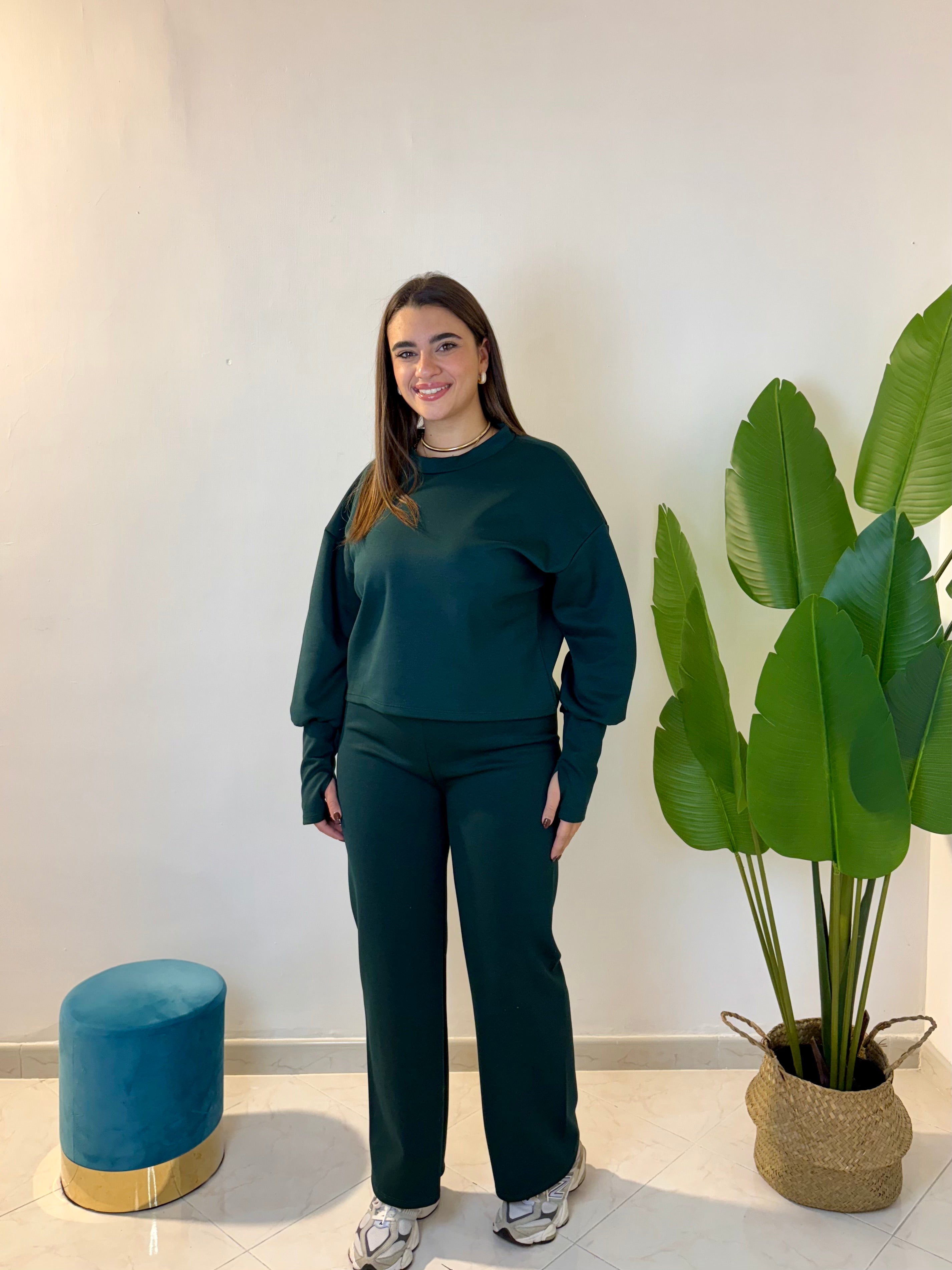 Coordinato super felpato, con felpa crop e pantalone zampetta, con elastico in vita. Veste da una 38 ad una 46.