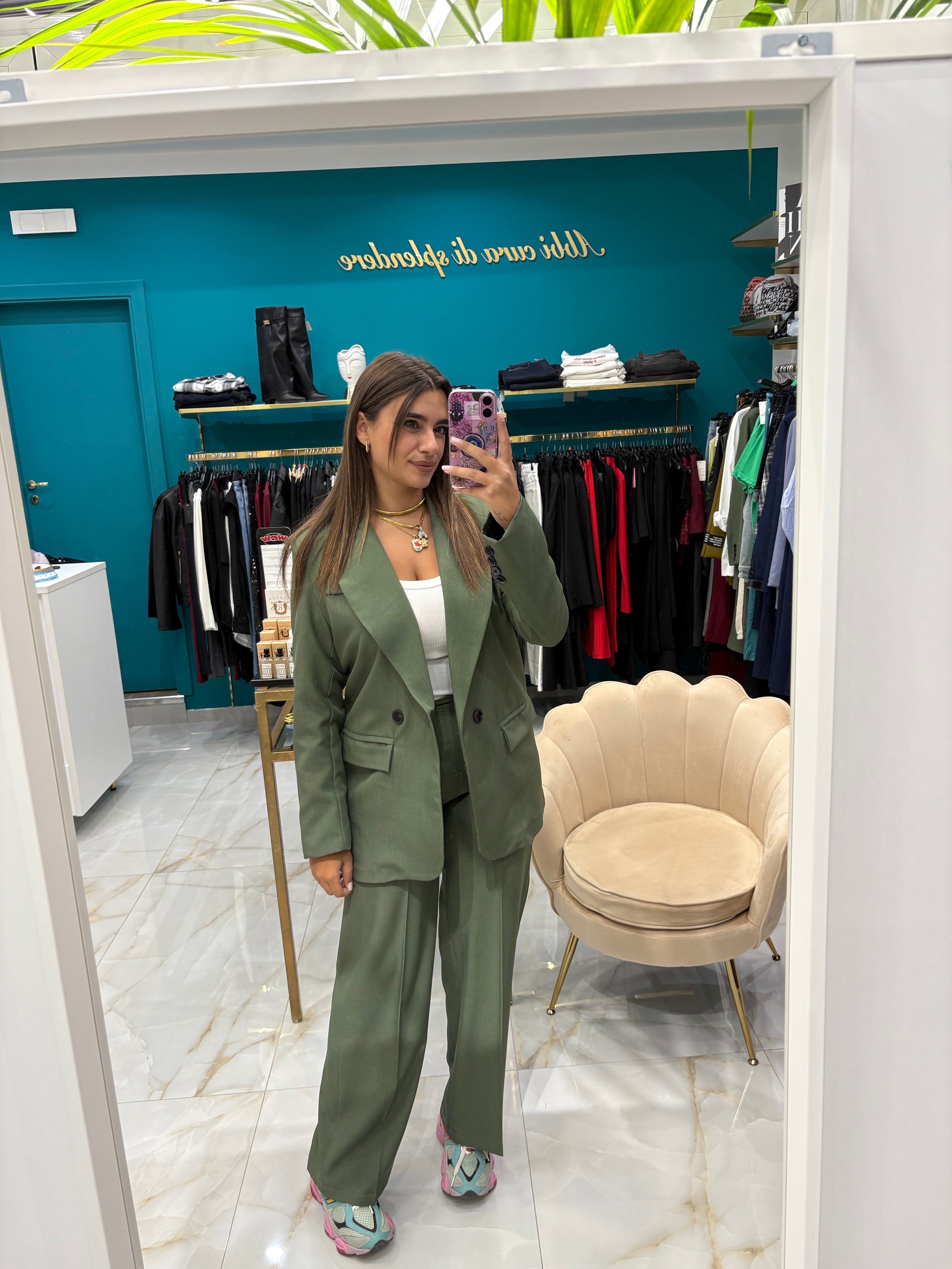 Tailleur con giacca doppio petto, pantalone palazzo con elastico in vita. Veste da una 38 ad una 46.